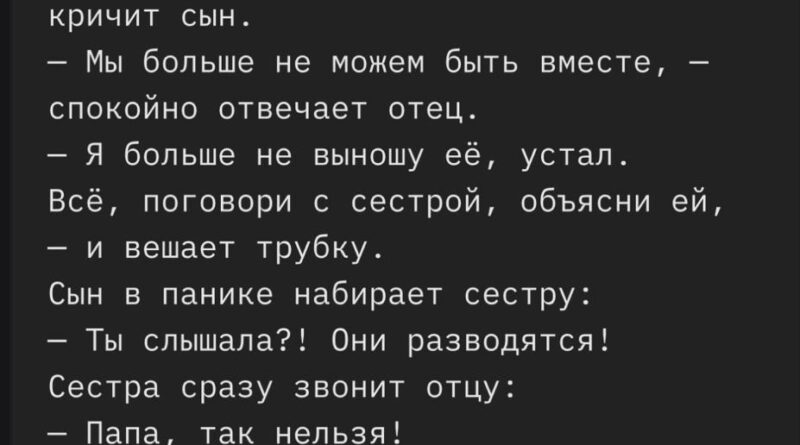 — Алло, сынок, — начал он тихо, почти робко, — мы с твоей мамой решили развестись. Хватит, сорок пять лет — уже перебор.