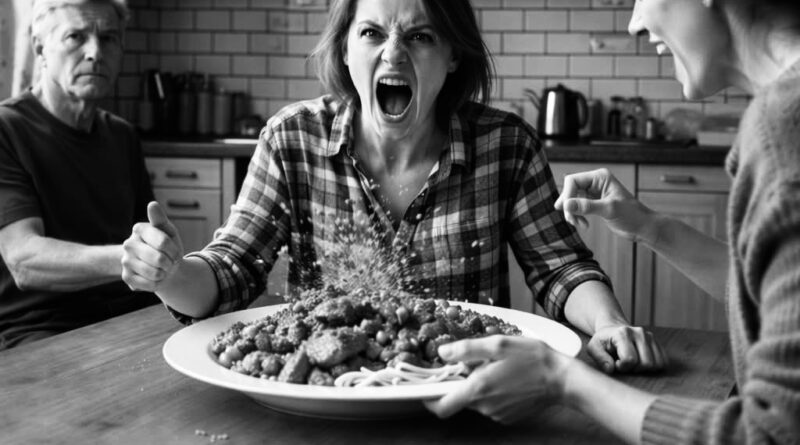 Время застыло. Куски мяса медленно сползали по ее щекам, соус капал с носа на кружевное жабо, кусок вареной моркови застрял в пышной прическе. Она сидела с открытым ртом, хватая воздух, и напоминала клоуна после неудачной репризы. Её глаза расширились от абсолютного, животного неверия в происходящее.