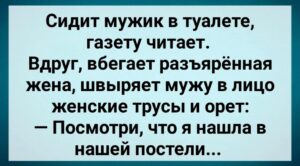 И вдруг дверь в ванную со страшным скрипом распахнулась. Вбежала его жена, Кларисса, вся в ярости. Лицо её пылало, глаза сверкали как два маленьких прожектора гнева, а в руках она сжала… женские трусы.