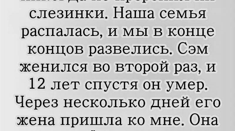 Я не понимала, о какой правде идёт речь. После похорон Сэма я не испытывала ни гнева, ни радости — только пустоту. За двенадцать лет без него боль притупилась, но не исчезла. Мы потеряли сына, а потом потеряли и себя. Он замкнулся, я кричала, мы обвиняли друг друга в том, что не могли изменить. Потом — развод.