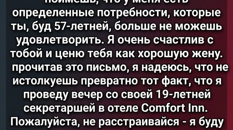 «Моя дорогая жена. Ты наверняка поймёшь, что у меня есть определённые потребности, которые ты, будучи 57-летней, больше не можешь удовлетворить. Я очень счастлив с тобой и ценю тебя как хорошую жену. Прочитав это письмо, я надеюсь, что не истолкуешь превратно тот факт, что я проведу вечер со своей 19-летней секретаршей в отеле Comfort Inn. Пожалуйста, не расстраивайся — я буду дома до полуночи».
