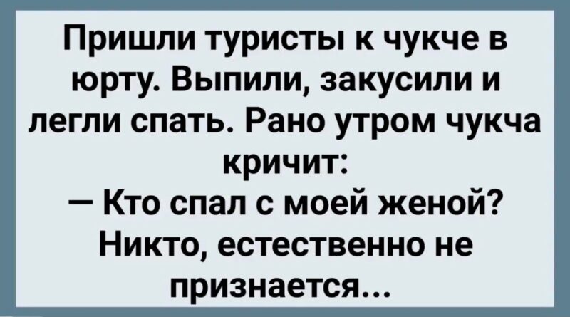 Read MoreПришли туристы к чукче в юрту. Выпили, закусили и легли спать.Рано утром чукча кричит: — Кто спал с моей женой?!