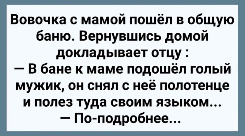 Read MoreГлава 1. Сборы в баню Вовочка жил в небольшом городке вместе с мамой и папой. Настала суббота, и мама решила,