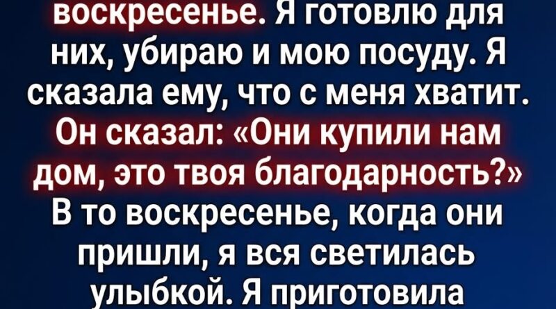 Read MoreСемья мужа из восьми человек приходила на обед каждое воскресенье.Свекровь, свёкор, два брата с жёнами и детьми — шумные, требовательные,