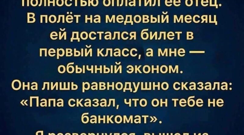 И вот настал день медового месяца. Мы шли к гейту, улыбаясь и пытаясь выглядеть счастливыми, но я уже знал, что этот полёт станет испытанием. Она получила билет в первый класс — просторное кресло, шампанское, изысканные блюда, внимание стюардесс. Мне достался эконом — тесное сиденье, шум вокруг, постоянное ощущение, что я нахожусь не там, где должен быть.