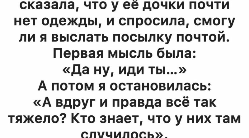 «Здравствуйте. Извините, что беспокою. Я увидела ваше объявление… У меня дочка, ей почти три года. Сейчас у нас сложная ситуация… Я одна, работы нет, живём далеко… У неё почти нет одежды, особенно тёплой. Скажите, пожалуйста, вы могли бы отправить посылку почтой? Я понимаю, что это неудобно…»