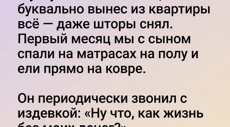 Он говорил это с таким холодным, насмешливым спокойствием, будто речь шла не о нас с сыном, а о каких-то чужих людях. Я сначала даже не понимала, как на это реагировать. В груди что-то сжималось, но слёз не было. Они пришли позже — ночью, когда сын уже спал, укрывшись старым пледом, а я сидела на том самом матрасе и смотрела в темноту.