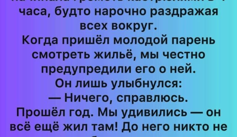 Обычно после этих слов люди начинали задавать вопросы. «Насколько громко?», «Можно ли поговорить с ней?», «А если вызвать полицию?» — но этот парень не спросил ничего.