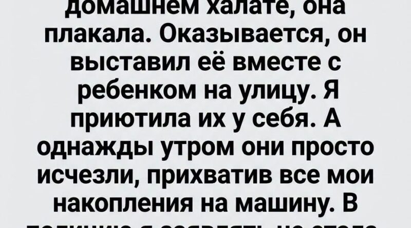 Сначала я не верила, что они могли так поступить. Я снова и снова прокручивала в голове тот день, когда впервые увидела её — растерянную, в тонком домашнем халате, с ребёнком на руках. Её глаза были красными от слёз, губы дрожали. Она говорила сбивчиво, почти шёпотом, боялась даже обернуться. Я тогда не раздумывала. Просто сказала: «Пойдём ко мне».