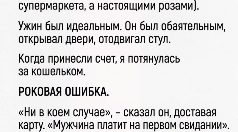 «Он обычно так себя не ведет», — продолжила она. «Я его знаю. Если ему не нравится девушка, он… ну, он просто не вкладывается. А тут… цветы, ресторан…»