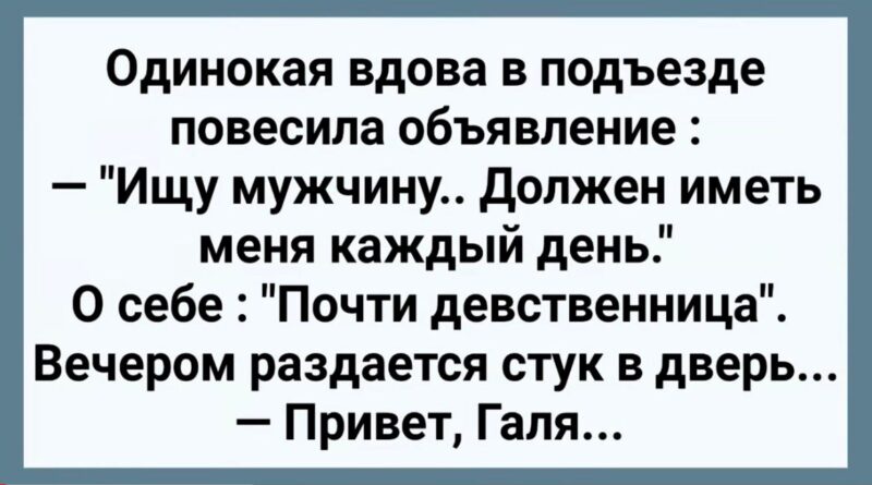 Одинокая вдова в подъезде повесила объявление : – « Ищу мужчину… Должен иметь = меня каждый день. » » О себе : « Почти девственница ». Вечером раздается стук в дверь… – Привет, Галя…