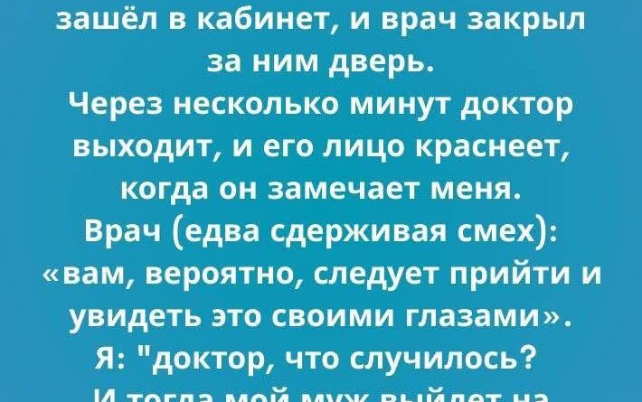 И вдруг дверь кабинета открылась, и врач вышел. Его лицо покраснело, губы дрожали — он явно сдерживал смех или смущение. Он взглянул на меня и, едва сдерживая улыбку, сказал: