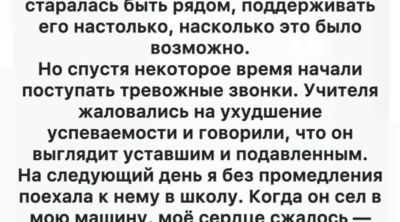 Первый тревожный звонок пришёл от классного руководителя, женщины внимательной, терпеливой, всегда аккуратно подбирающей слова. Она сказала, что мой сын стал хуже учиться. Не катастрофически — просто… хуже. Меньше тянет руку, часто сидит с отсутствующим взглядом, будто в собственных мыслях. Пару раз забывал дома тетради — для него это было несвойственно. Я попыталась не паниковать: переходный период, привыкание к новой обстановке, бытовые перемены — всё это вполне могло дать такой эффект.