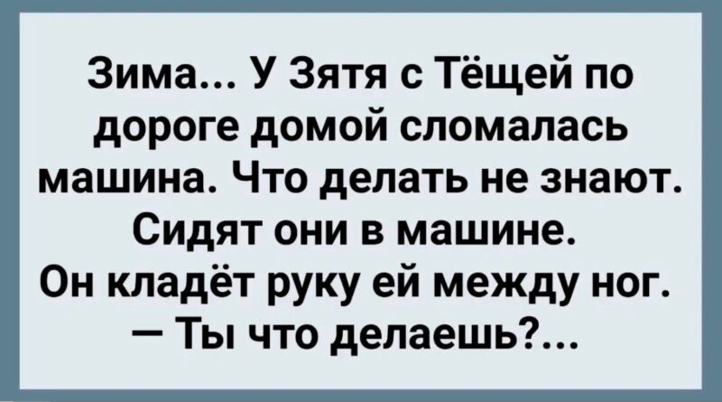 Тёща хихикнула: — Думаю, я бы нашла способ согреться и рассказать тебе пару историй, чтобы время прошло быстрее. А утром мы бы пошли пешком, если машина откажет.