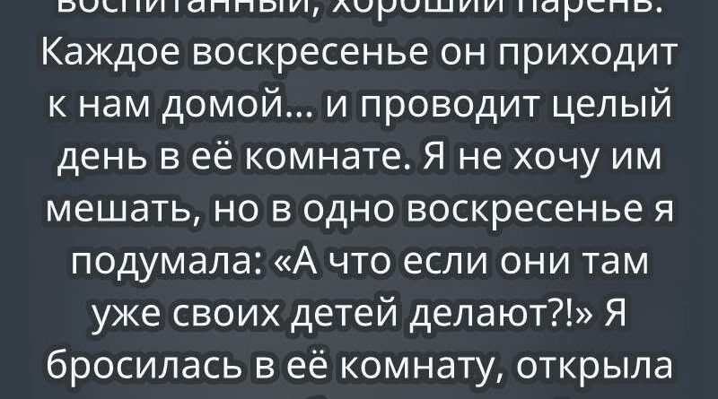 Но в одно воскресенье внутри меня вдруг проснулось беспокойство. Я стояла в дверях её комнаты, и в голове крутились самые странные мысли: «А что же они там делают целый день? Чем заняты?» Я знала, что не должна вмешиваться, но любопытство оказалось сильнее. Я осторожно толкнула дверь…