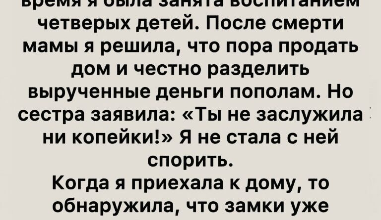 Я решила, что продам дом, но останусь спокойной и действовать буду честно, без ссор и конфликтов. Однако когда я приехала к дому, чтобы оформить все формальности, то обнаружила, что замки уже поменяли. Сердце сжалось от неожиданности, но я не растерялась. Найдя другой способ попасть внутрь, я вошла — и то, что я увидела, заставило меня остолбенеть.