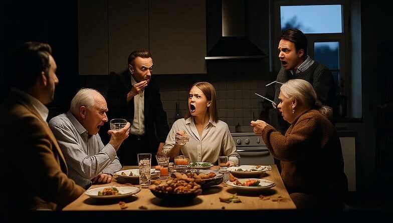 Отец сидел, сжимая бокал с водкой, взгляд его был тяжёлым и холодным, как будто он уже заранее выносил свой приговор. Старшая сестра Катя улыбалась слишком широко, словно в её улыбке скрывалась тайная победа, а её муж Дима тихо посмевал, наслаждаясь вниманием к себе и внутренним удовлетворением, что сейчас он «важен». Дядя Вася лениво облокотился на спинку стула, сигарета в руке уже успела догореть до половины, а тётя Люда, как всегда, готовила нападение, перебирая ножи и вилки с тихим щелчком, словно предчувствуя, что этот вечер будет долгим.