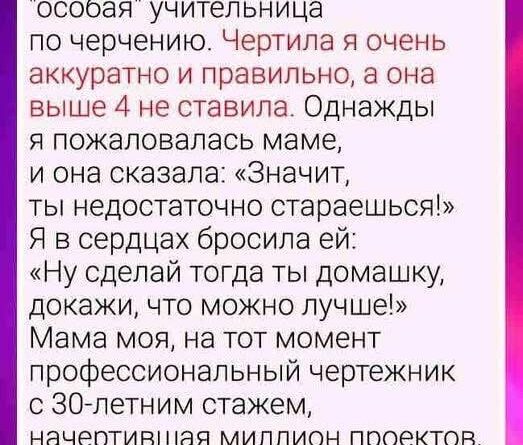 Особенно больно было видеть, как троечники, которые путали масштаб и чертили от руки без линейки, вдруг получали свои заветные «пять» — за «старание», за «активность», за «правильное отношение к предмету». А я — за аккуратность, за точность, за молчаливую работу — получала максимум «хорошо».