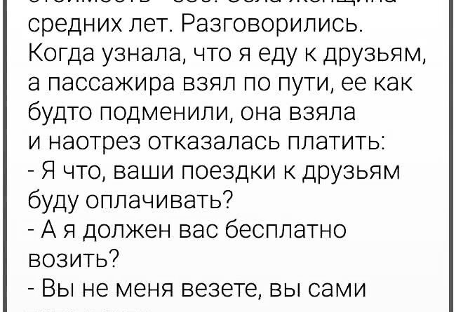 Я понял, что спор бесполезен. Для нее логика была простой: если водитель едет в ту же сторону, значит, пассажир — не клиент, а попутчик, который не обязан платить.