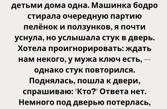 Сердце забилось сильнее. В нашем доме никто просто так не приходил — особенно вечером. Все соседи знали: у нас маленькие дети. Муж на работе. Родителей поблизости нет.