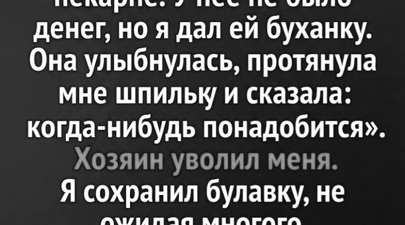 — Шесть недель назад ты дал мне хлеб, — сказала женщина, держа руку на животе. — И это спасло меня. Булавка — это символ. Она соединяет наши пути. Сегодня твоя доброта вернулась к тебе, но испытание будет непростым.