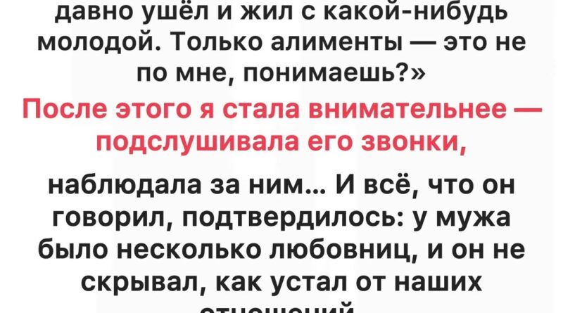 С того момента я стала внимательнее. Сначала это были случайные взгляды на его телефон, на сообщения и звонки, потом — целенаправленное наблюдение. Я начала замечать странные отлучки, поздние возвращения домой и постоянное напряжение в его глазах, когда он говорил со мной. С каждым днем мои подозрения укреплялись: его разговоры подтверждали, что у него были любовницы, и что он не скрывал своего разочарования в наших отношениях.