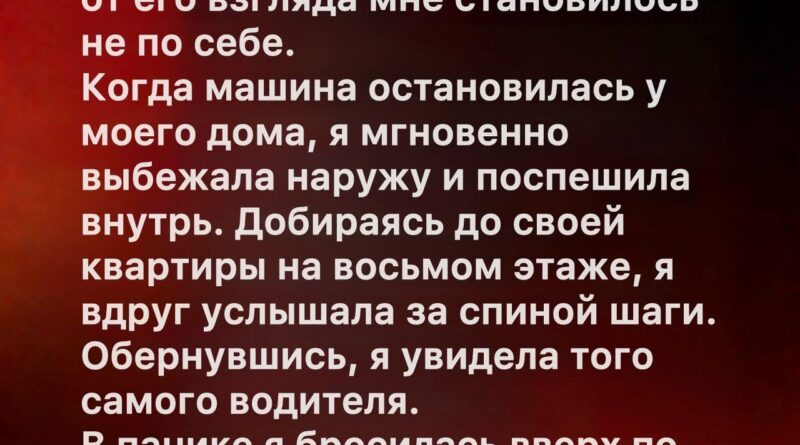 Я спешила по лестнице, ускоряя шаг, чувствуя, как адреналин разрывает тело изнутри. Уже на третьем этаже я услышала шаги за спиной. Они были неторопливы, размеренны и угрожающе спокойны. Сердце замерло. Я обернулась и увидела его — того самого водителя, который только что привёз меня домой. Он шел за мной.