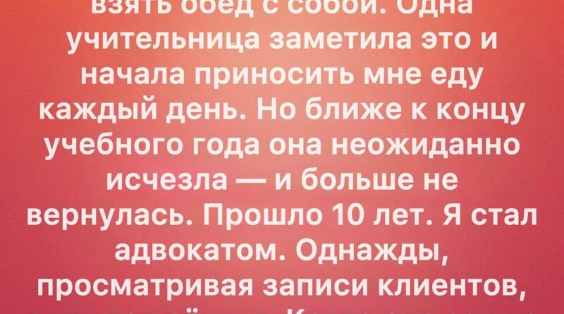 И вот этот день настал — десять лет спустя. Я сидел в своём кабинете, разбирая документы клиентов, когда увидел имя, которое заставило меня замереть. Сердце забилось быстрее, а дыхание стало прерывистым. Это было имя той самой учительницы. Я не верил своим глазам. Вскоре дверь медленно открылась, и она вошла. В тот момент всё вокруг словно исчезло. Время сжалось, и я снова оказался четырнадцатилетним мальчишкой, который боялся голода, но впервые почувствовал, что кто-то верит в него.