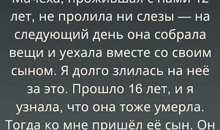 С нами жила моя мачеха — женщина, которая вошла в нашу жизнь, когда я была ещё ребёнком. Она прожила с нами двенадцать лет. За это время я привыкла к её присутствию, пусть и не всегда теплому. После смерти отца я ждала, что она будет так же опечалена, как и я, что мы будем вместе, разделяя боль, воспоминания, слёзы. Но на следующий день после похорон она собрала свои вещи и уехала вместе со своим сыном. Тогда я не понимала её, я злилась и обижалась. Мне казалось, что её холодность — это предательство.