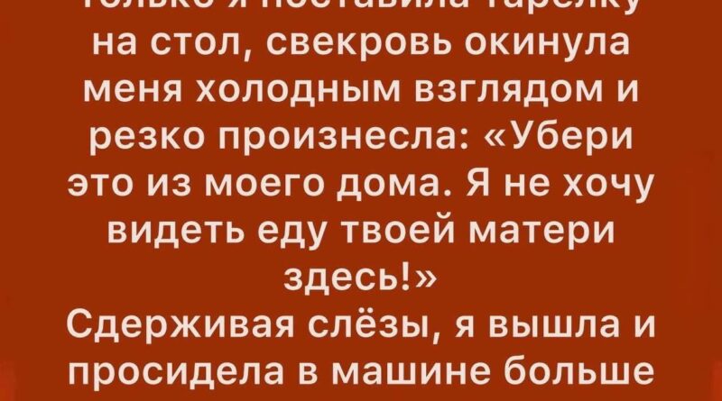 Мир вокруг меня рухнул. Сердце замерло, дыхание сбилось, а в глазах наворачивались слёзы. Я не понимала. Почему? Что в этом такого ужасного? Это было блюдо моей мамы, её любовь, её тепло… Я представила, как она гордилась бы мной, и боль оттого, что её память была отвергнута так грубо, была почти физической.