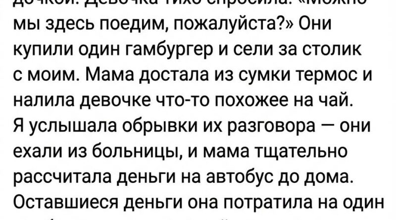 Дома меня встретила тишина. Я сняла пальто, поставила сумку на стул и вдруг поймала себя на странном желании — вернуться туда, в «Макдоналдс», и посмотреть, что с ними. Разум тут же одёрнул: не надо. Ты уже всё сделала. Не превращай это в историю «про себя».