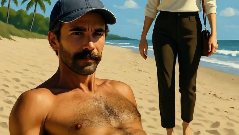 Чтобы отвлечь внимание, он попытался изобразить непринужденность. С лёгкой улыбкой на лице Михаил аккуратно переместил кепку, словно это был какой-то модный аксессуар, и попытался показать, что всё в порядке, что это часть его пляжного «арт-перформанса». Но женщина явно не была готова к участию в этом перформансе.