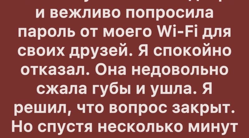 — Привет, — слышен был её голос, мягкий, но настойчивый. — Слушай, можешь дать пароль от Wi-Fi? Моим друзьям срочно нужно.