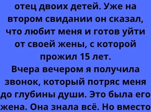Но вчера вечером всё перевернулось. Телефонный звонок, который я получила, потряс меня до глубины души. На другом конце провода была она — его жена. Женщина, с которой он прожил пятнадцать лет, мать его детей. Я ожидала агрессии, крика, обвинений. Я ждала, что услышала бы слова ярости и ненависти. Но вместо этого… вместо нападок она говорила спокойно, с такой уверенностью и мягкостью, что это казалось почти нереальным.