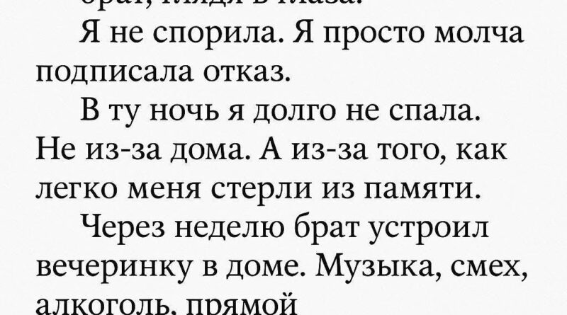 Я подписала отказ. Бумажка в моих руках дрожала едва заметно. В ту ночь я не могла уснуть. Не из-за дома. Не из-за того, что утратила имущество. А из-за того, как легко меня стерли из памяти. Как будто меня никогда и не было.