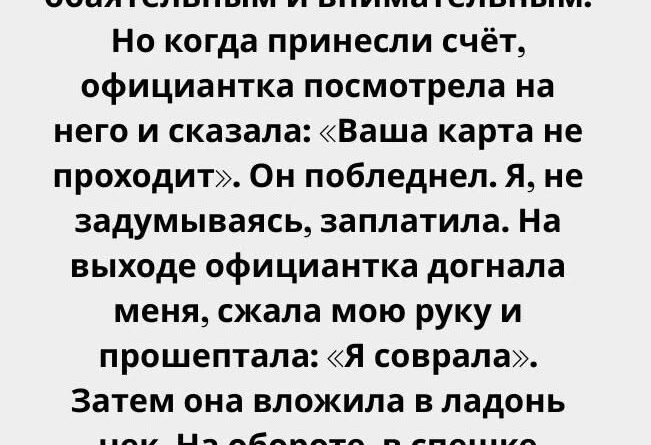 Я замерла, не понимая сначала, что она имела в виду. Её лицо было серьёзным, но в глазах мелькнула искорка странной тайны. Она вложила в мою ладонь маленький чек. На обороте, в спешке, были написаны два слова, которые перевернули моё представление о вечере и о человеке рядом со мной…