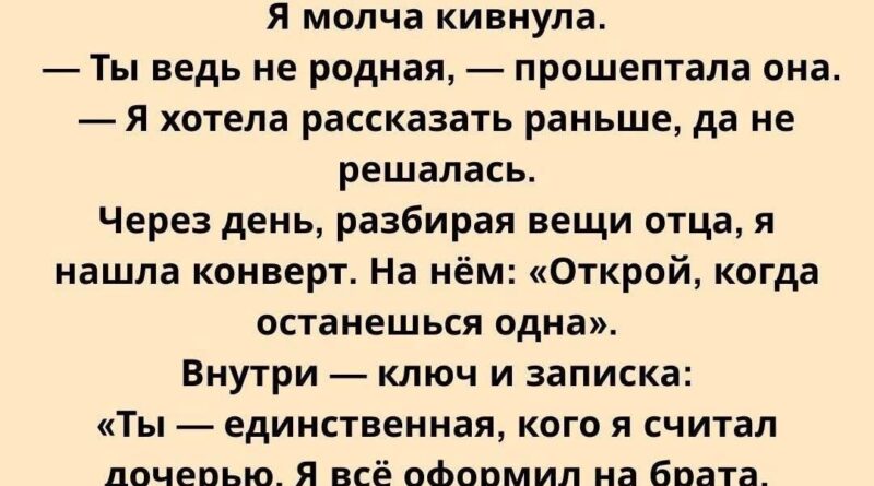 Мама опустила взгляд, словно пытаясь найти в моих глазах что-то, чего раньше не замечала. «Ты ведь не родная, — прошептала она почти беззвучно».