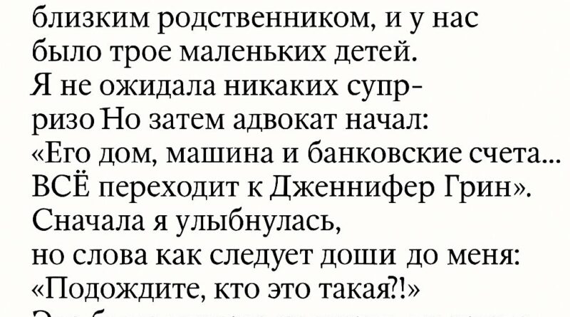 На том конце провода был его адвокат — строгий, деловой голос, который обычно внушал доверие и уверенность. Он позвонил, чтобы зачитать завещание. Я была единственным близким родственником моего мужа. Я ожидала, что его имущество, накопления и дом перейдут к нам, его семье.