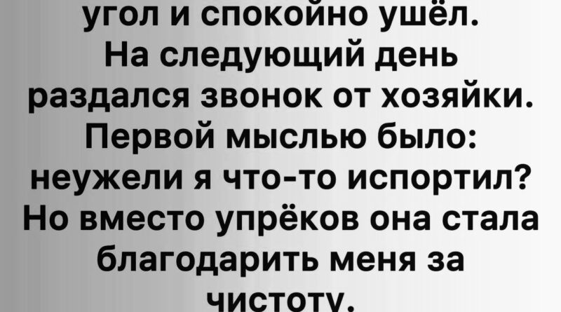 На следующий день раздался звонок от хозяйки. Моё сердце сжалось на мгновение — первое чувство всегда бывает тревожным. «Неужели я что-то испортил?» — промелькнула мысль. Но вместо упрёков, вместо раздражения я услышал благодарность. Она говорила спокойно, с удивлением и теплотой, как будто сама не ожидала, что арендаторы бывают настолько внимательными и ответственными. И в тот момент, когда её слова проникали в меня, я понял: иногда даже маленький акт заботы может оставить после себя что-то большее, чем просто чистоту.