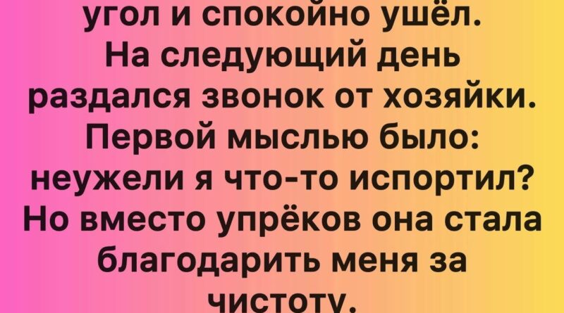 Иногда люди считают, что простые действия не имеют значения. Но я узнал, что именно в простоте и внимании к деталям кроется настоящая сила. Оставив квартиру в идеальном порядке, я не просто выполнял обязанности арендатора — я создавал уважение и доверие, дарил радость и удивление. И в этом проявилась настоящая магия человеческого взаимодействия: без слов, без требований, без наград — просто через заботу.