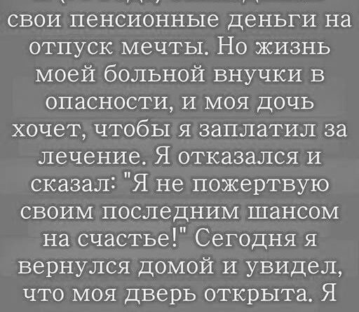 Но в моём сердце оставался груз. Я знал, что деньги, которые я отложил на отпуск, больше никогда не вернутся. Иногда ночью я просыпался, и мысленно летал в те места, где хотел побывать, и где никогда не окажусь. Сердце сжималось, но в эти же моменты я понимал: настоящая жизнь — это не отпуск на экзотическом острове, а возможность быть рядом с теми, кого любишь.