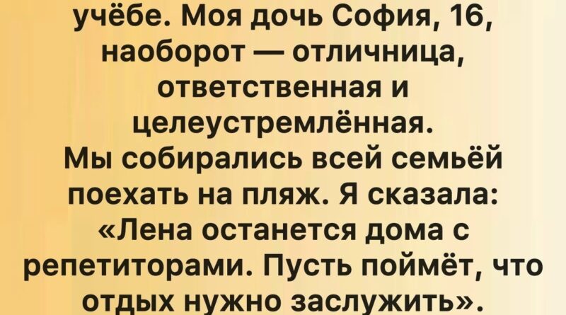 Я стояла на кухне, смотря на её безразличное лицо, и почувствовала раздражение и одновременно жалость. «Может, отдых нужно заслужить?» — подумала я. И, не сдержавшись, сказала мужу: «Лена останется дома с репетиторами. Пусть поймёт, что отдых нужно заслужить».