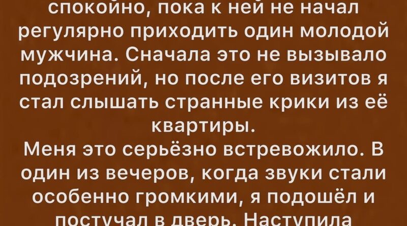Через несколько недель ситуация достигла апогея. Однажды ночью я услышал ужасающий крик, который заставил меня буквально дрожать. Я выбежал из квартиры и побежал к двери соседки. Сердце билось так, что казалось, оно вот-вот выскочит из груди. Я стучал, кричал её имя, но никто не открывал. Тогда я услышал тихий скрип замка — и дверь медленно приоткрылась.