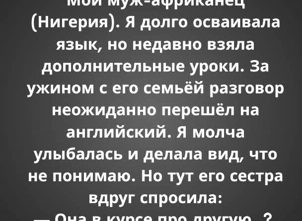 И вот, однажды вечером, мы с мужем отправились к его семье на ужин. Дом был наполнен смехом, шумом посуды и ароматами традиционных нигерийских блюд. Я старалась внимательно слушать и вовремя кивать, улыбаться, поддерживать беседу. Всё шло хорошо, пока разговор вдруг неожиданно не перешёл на английский — язык, которым я ещё не чувствовала себя полностью уверенно.