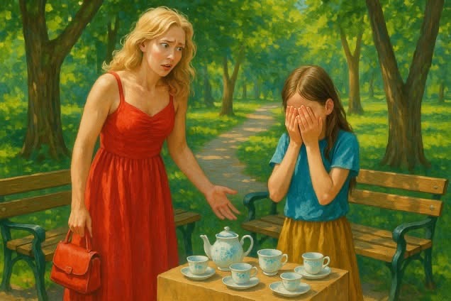 Она уже свернула к главному фонтану, как вдруг её взгляд зацепился за странную сцену. Невысокая фигурка девочки стояла у самой обочины аллеи. Рядом — большая картонная коробка, на которой были выставлены чашки, блюдца и чайнички. Девочка казалась потерянной среди яркого и шумного парка, словно выбивалась из общей картины.