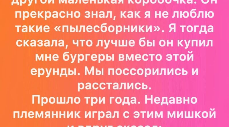 В тот день я поняла, что маленькая игрушка, которую я когда-то считала бессмысленным «пылесборником», стала символом чего-то гораздо большего. Символом прощения, принятия и памяти о том, что любовь проявляется в самых неожиданных формах.