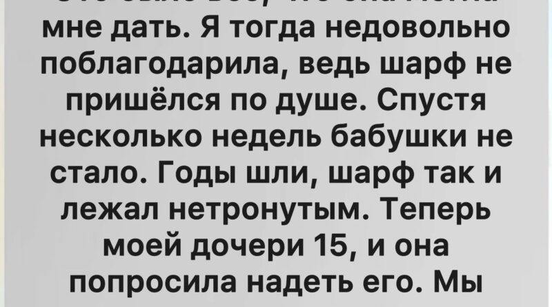 После того дня шарф занял особое место в нашей жизни. Он больше не был просто старой вещью на полке — он стал связующим звеном между поколениями, между мной, моей дочерью и бабушкой, которую мы обе так любили. Каждое утро, когда дочь накидывала его на плечи, казалось, что комната наполняется тихой энергией, мягким светом, который нельзя было увидеть глазами, но можно было почувствовать всем телом.