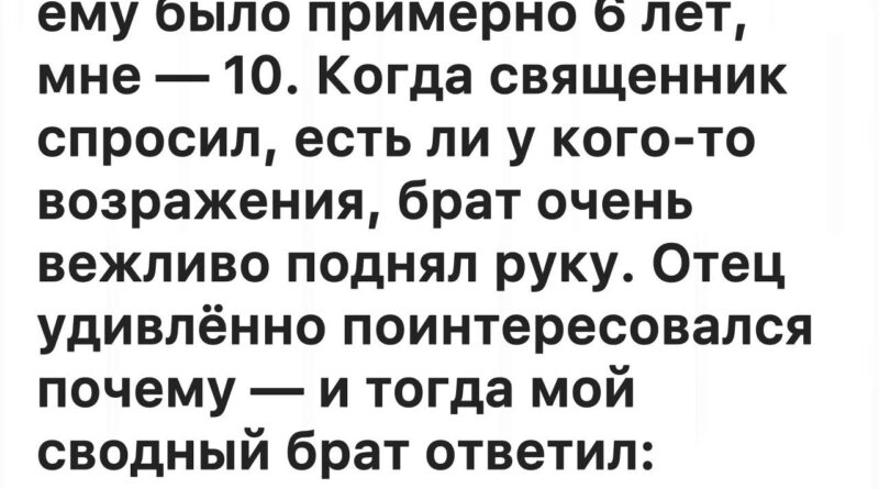 Мгновение настороженной тишины. Все слегка замерли, и я видел, как отец напрягся. Свадьба — это не только радость, это и формальность, в которой любое слово может иметь огромное значение. И вдруг Сергей, мой шести-летний сводный брат, очень вежливо поднимает руку.