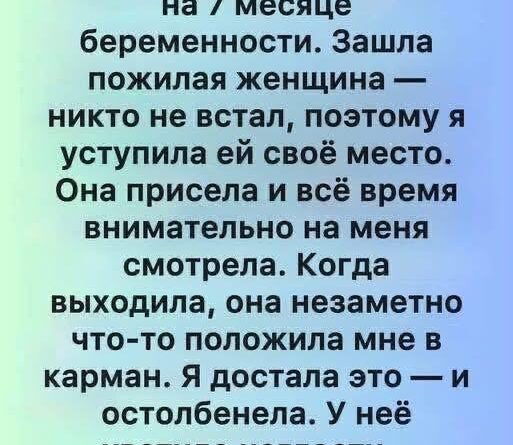 — Я тоже была беременна. Тоже ехала в автобусе. И тоже очень боялась. — Она тихо усмехнулась. — Тогда чужая женщина положила мне в карман записку. Я прочитала — и плакала всю ночь. А потом поняла, что она была права.
