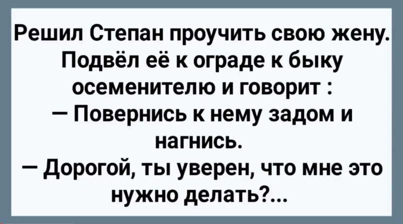 Степан давно злился на жену — ему казалось, что она перестала его слушать и слишком часто спорит по пустякам. Однажды, решив «проучить» её и заодно подшутить, он подвёл её к ограде, за которой стоял огромный бык-осеменитель. Животное тяжело сопело и время от времени билось рогами о деревянные перекладины.